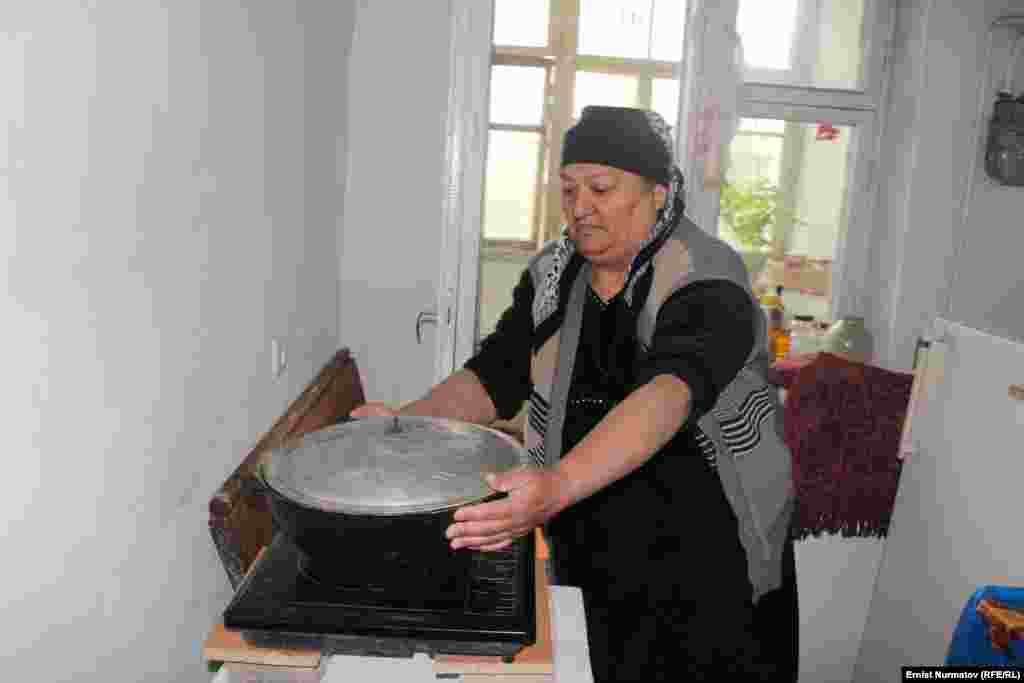 Ош шаарынын тургуну Ирсолат Исмаилова төрт кабат үйдүн балконуна орнотуп алган темир мешке тамак даярдоодо.