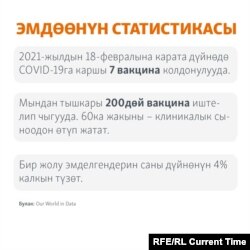 «Алгач болуп, дарыгерлер, мугалимдер жана милиция кызматкерлерин эмдөөнү пландап жатабыз. СOVAX программасынын алкагында 1 млн. 200 миң доза вакцина алган жатабыз. Алардын баары эсептелген. Негизи 3,5-4 млн. доза вакцина келсе, биз эмдөө ишин ыкчам уюштурууга даярбыз. Эки ай ичинде эмдөөнү уюштурса болот. Анткени, ар бир райондогу ооруканалар, фельдшердик-акушердик пункттар даярдалды. Улуттук программанын алкагында иш жүрүшү керек», - деген саламаттык сактоо жана социалдык өнүктүрүү министри Алымкадыр Бейшеналиев "Азаттык" радиосуна курган маегинде.